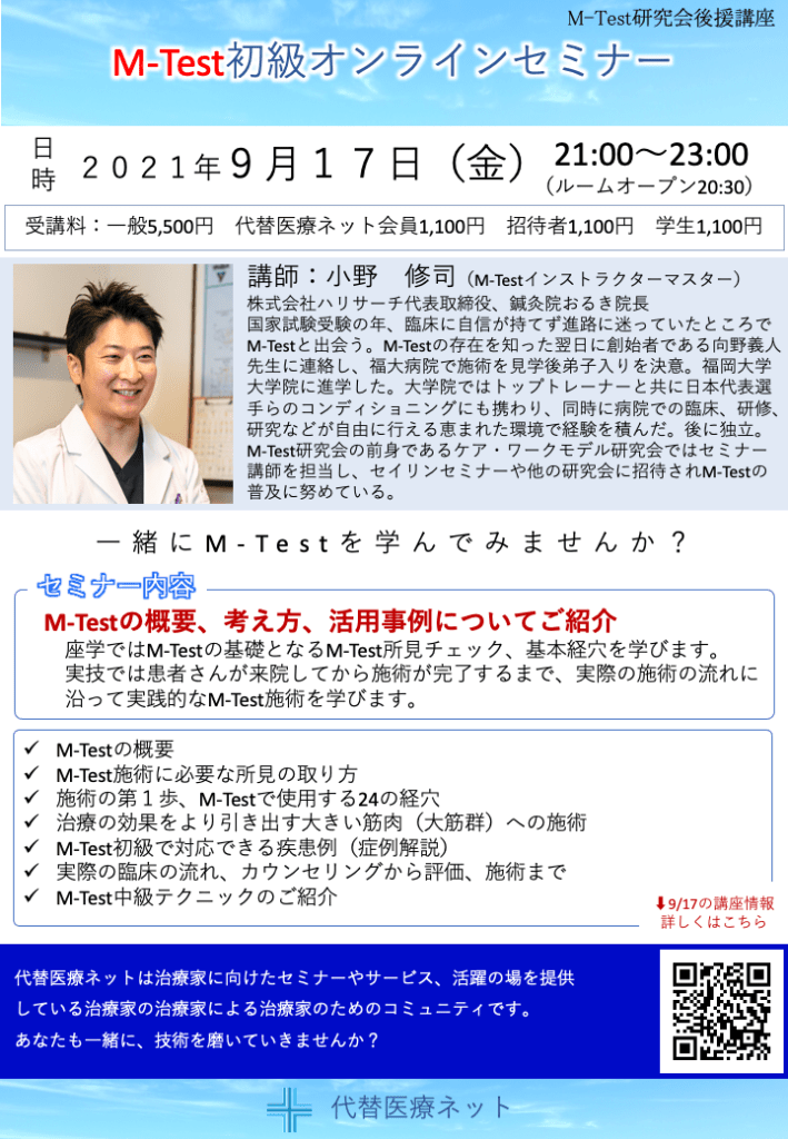 9月17日㈮にM-Testインストラクターマスターの小野修司先生によるM-Test初級オンラインセミナーが実施されました。