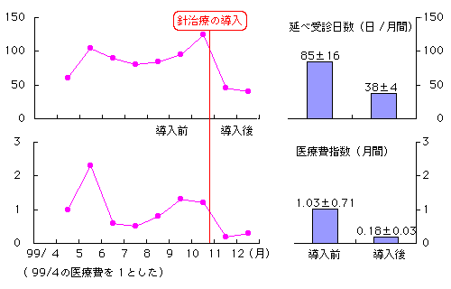 4月から10月までの運動器疾患による受診日数の平均が89回であったのに対して11月、12月は平均38日であり半分以下になっていた。運動器疾患の4月の医療費を1とし、それに対する比で表すと4月から10月の運動器疾患の医療費は平均1.03であり、11月および12月の平均は0.18であった。鍼治療期の運動器疾患の医療費が約1/5にまで減少した事を示しており、鍼灸治療の導入で医療費削滅が達成できる可能性があると考えられた。