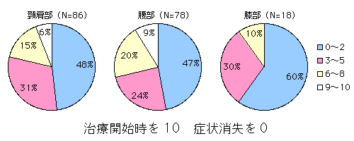 図1に治療8週後の腰痛や頚肩痛などの痛みの主親的尺度を示したが、痛みが受診時の2割以下にまで減少したのは頚肩痛で48%、腰痛で47%、膝痛で60%であり、痛みが半滅したものはそれぞれ79%、71%、90%に達した。