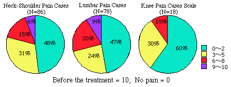 Figure 1 shows the subjective pain scale after 8 weeks of our treatments. 48% of shoulder pain cases, 47% of lumbar pain cases, and 60% of knee pain cases reported that their pains were reduced more than 80%. 79% of shoulder pain cases, 71% of lumbar pain cases, and 90% of knee pain cases reported that their pains were reduce more than 50%.